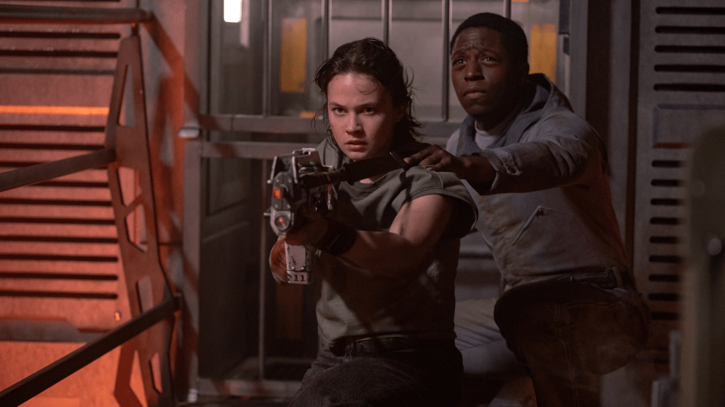 This film is NOT a continuation of Alien Covenant and the Prometheus direction. Think of it as another unrelated story in the Alien world, where Weyland Industries is the dominant name in space exploration, mining, terra-forming and building worlds. Remember that in Alien the ship Nostromo was a mining space craft returning back to Earth, before being sidetracked in a rescue mission for a distress signal on an unknown planet. Here we have a much younger group of miners in a dreary planet that gets no sunshine at all. These seemingly twenty-somethings don’t like their lot in life, and one has this idea to leave the planet and explore a nearby space ship which has been decommissioned and presumably abandoned and empty. Inside there are some cryogenic pods that would allow these young people to head off to a new and more exciting planet. Early on we see our main protagonist Cailee Spaeny (Rain) and her brotherly companion and we learn that he is a synthetic named Andy (played by David Johnson). He is constantly being picked on.